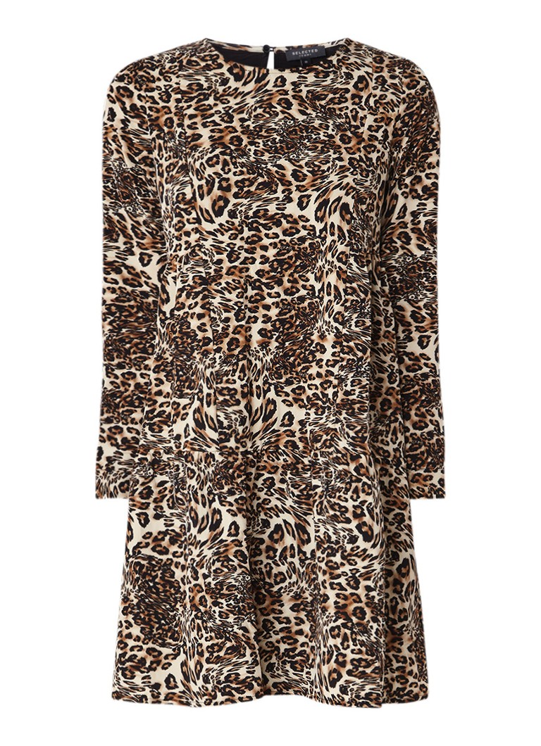 Scotch & Soda A-lijn jurk met ruches met luipaarddessin cognac