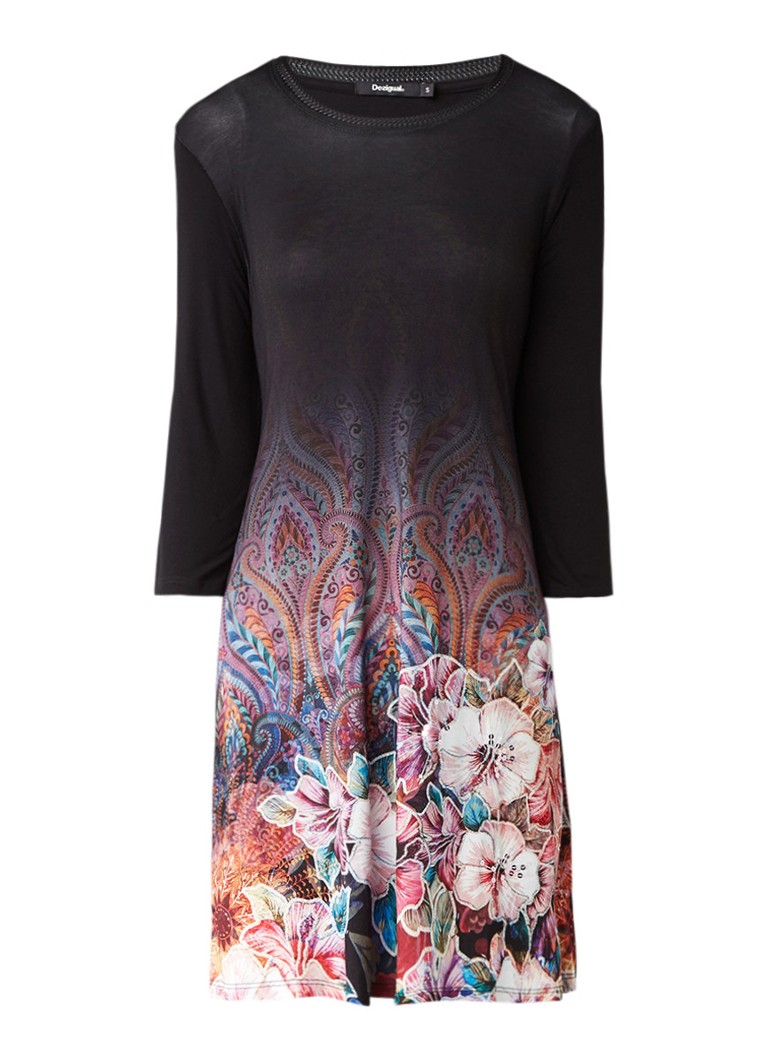Semi-transparante jurk met grafisch dessin en gedecoreerde halslijn zwart