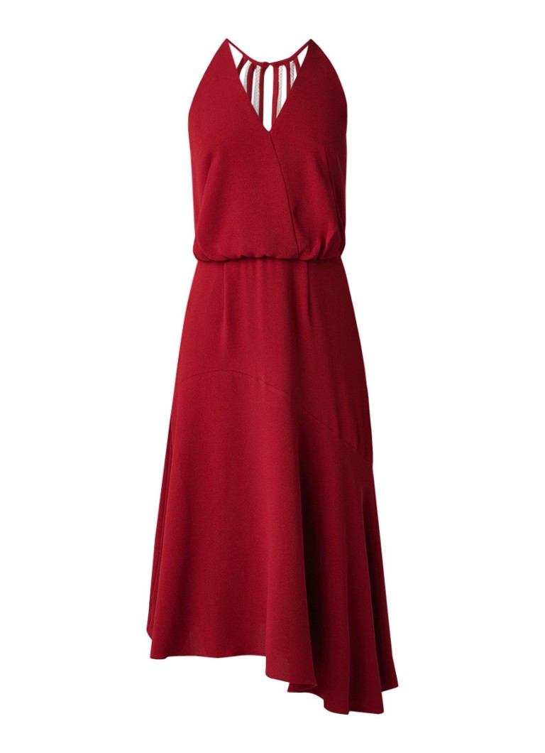True-fitted gedrapeerde jurk met rugdecolleté bordeauxrood